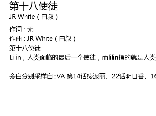 | 第十八使徒 Lilin,人类面临的最后一个使徒,而lilin指的就是人类自己。使徒正是人类其他可能的存在形态,如同兄弟般的生命体。使徒得到了生命之果,人类得到了智慧之果,AT力场太弱,便化成了无数个人类。 | |