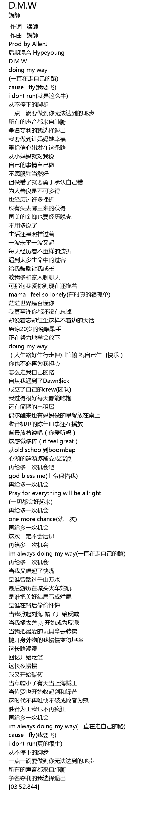 | [03:38.093] | im always doing my way yī zhí zài zǒu zì jǐ de lù |