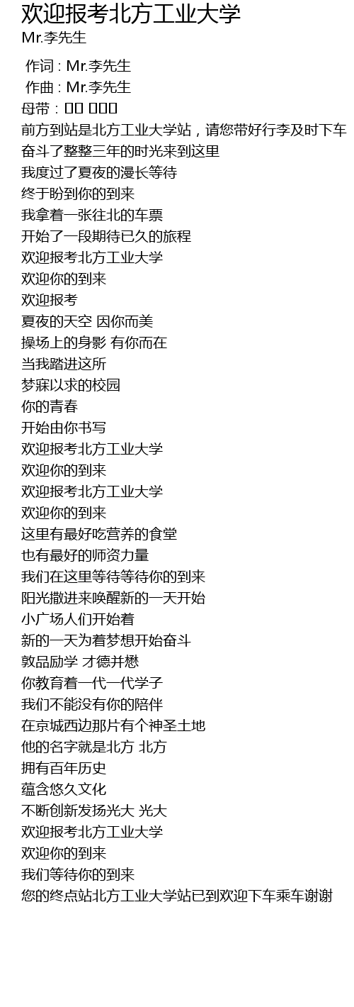 | Song | 欢迎报考北方工业大学 |