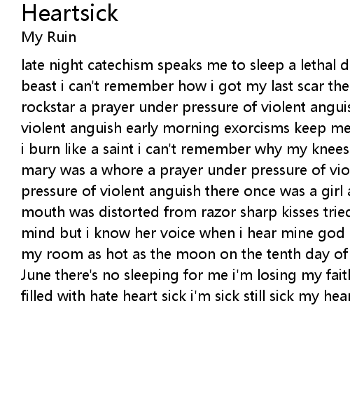 late night catechism speaks me to sleep a lethal dose of narcissism conquers the beast i can't remember how i got my last scar the bible tells us jesus was a rockstar a prayer under pressure of violent anguish a prayer under pressure of violent anguish early morning exorcisms keep me awake seven stars surround me as i burn like a saint i can't remember why my knees are so sore the bible tells us mary was a whore a prayer under pressure of violent anguish a prayer under pressure of violent anguish there once was a girl and she suffered from sickness mouth was distorted from razor sharp kisses tried to pretend it was all in her mind but i know her voice when i hear mine god are you listening i hear you in my room as hot as the moon on the tenth day of