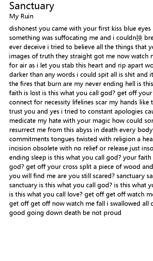 | dishonest you came with your first kiss blue eyes sold me your heavenly presence something was suffocating me and i couldn yāng breathe had no idea that you would ever deceive i tried to believe all the things that you taught me christlike images of truth they straight got me now watch me drown in sadness my lungs gasp for air as i let you stab this heart and rip apart wounds that exist deeper and darker than any words i could spit all is shit and it will never be well because the fires that burn are my never ending hell is this what you call god? your faith is lost is this what you call god? get off your cross get off bridges connect for necessity lifelines scar my hands like the rest of me asked me to trust you and yes i tried to constant apologies caused me to lie too tried to medicate my hate with your magic how could something so sweet end up so tragic resurrect me from this abyss in death every body function fails to exist false commitments tongues twisted with religion a heart shaped rock of the same size incision obsolete with no relief or release just insomnia filled nights of never ending sleep is this what you call god? your faith is lost is this what you call god? get off your cross split a piece of wood and i am there lift a stone and you will find me are you still scared? sanctuary sanctuary sanctuary there zhā no sanctuary is this what you call god? is this what you call god is this is this is this what you call love? get off get off watch me get off get off watch me get off get off now watch me fall i swallowed all of your lies and they felt good going down death be not proud |
