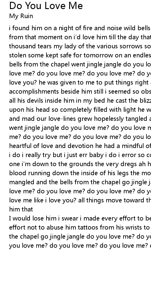i found him on a night of fire and noise wild bells rang in a wild sky i knew from that moment on i'd love him till the day that i died and i kissed away a thousand tears my lady of the various sorrows some begged some borrowed some stolen some kept safe for tomorrow on an endless night silver star spangled the bells from the chapel went jingle jangle do you love me? do you love me? do you love me? do you love me? do you love me? do you love me? do you love me like i love you? he was given to me to put things right and i stacked all my accomplishments beside him still i seemed so obselete and small i found god and all his devils inside him in my bed he cast the blizzard out a mock sun blazed upon his head so completely filled with light he was his shadow fanged and hairy and mad our love-lines grew hopelessly tangled and the bells from the chapel went jingle jangle do you love me? do you love me? do you love me? do you love me? do you love me? do you love me? do you love me like i love you? he had a heartful of love and devotion he had a mindful of tyranny and terror well i try i do i really try but i just err baby i do i error so come find me my darling one i'm down to the grounds the very dregs ah here he comes blocking the sun blood running down the inside of his legs the moon in the sky is battered and mangled and the bells from the chapel go jingle jangle do you love me? do you love me? do you love me? do you love me? do you love me? do you love me? do you love me like i love you? all things move toward their end i knew before i met him that |