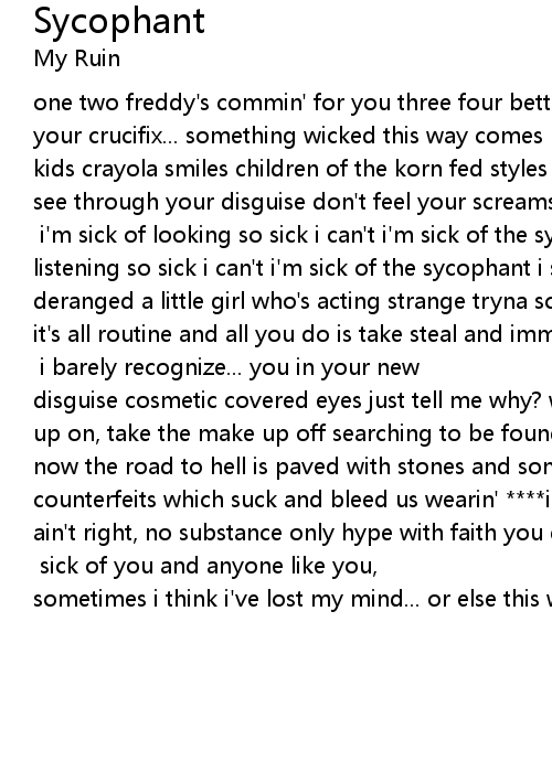 one two freddy's commin' for you three four better lock your door five six grab your crucifix... something wicked this way comes premeditated evil numbs cartoon kids crayola smiles children of the korn fed styles but i don't buy your lies i see through your disguise don't feel your screams or cries why?........... [chorus] i'm sick of looking so sick i can't i'm sick of the sycophant sick of listening so sick i can't i'm sick of the sycophant i see you breathless and deranged a little girl who's acting strange tryna scare us with your scream but it's all routine and all you do is take steal and immitake you and what you create your fake!..... [repeat chorus] i barely recognize... you in your new disguise cosmetic covered eyes just tell me why? why? why? why? you put the make up on, take the make up off searching to be found but you're so ****in' lost.... now the road to hell is paved with stones and some of them are fakes and clones counterfeits which suck and bleed us wearin' ****in' adidas but something just ain't right, no substance only hype with faith you got the life that made you rich and a punk ass bitch!.... [repeat chorus] sick of you and anyone like you, sometimes i think i've lost my mind... or else this whole world's blind!