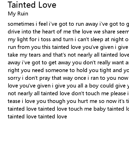 sometimes i feel i've got to run away i've got to get away from the pain you drive into the heart of me the love we share seems to go nowhere and i've lost my light for i toss and turn i can't sleep at night once i ran to you now i'll run from you this tainted love you've given i give you all a boy could give you take my tears and that's not nearly all tainted love now i know i've got to run away i've got to get away you don't really want any more from me to make things right you need someone to hold you tight and you think love is to pray but i'm sorry i don't pray that way once i ran to you now i'll run from you this tainted love you've given i give you all a boy could give you take my tears and that's not nearly all tainted love don't touch me please i cannot stand the way you tease i love you though you hurt me so now it's time you pack your things and go tainted love tainted love touch me baby tainted love don't touch me with your tainted love tainted love