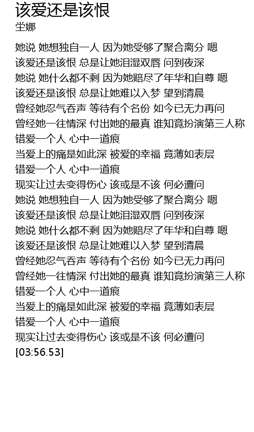 | [03:03.12] | 该爱还是该恨 总是让她难以入梦 望到清晨 |