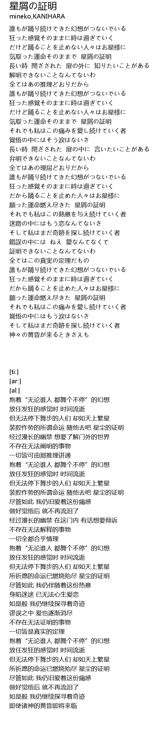 | [02:38.62] | 願った運命燃え尽きた 星屑の証明 |