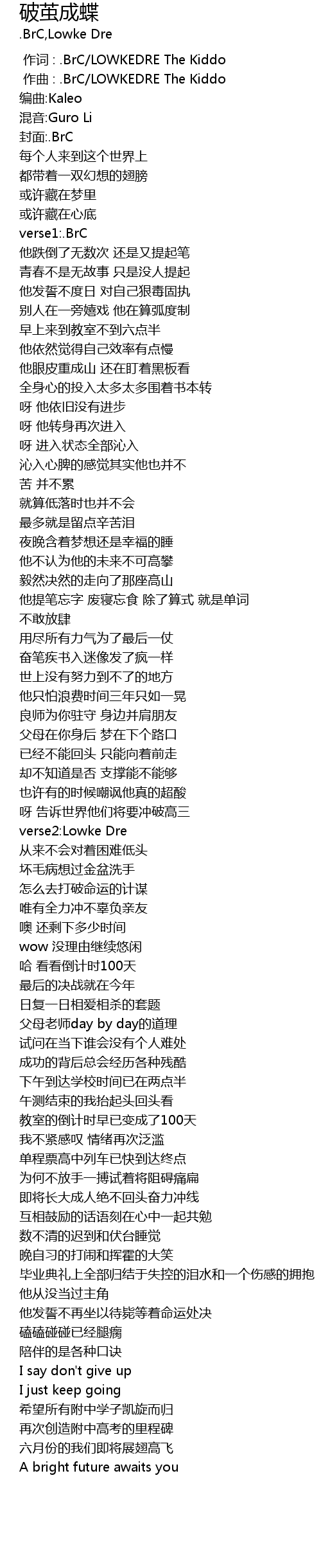 | [01:18.923] | 呀 告诉世界他们将要冲破高三 |