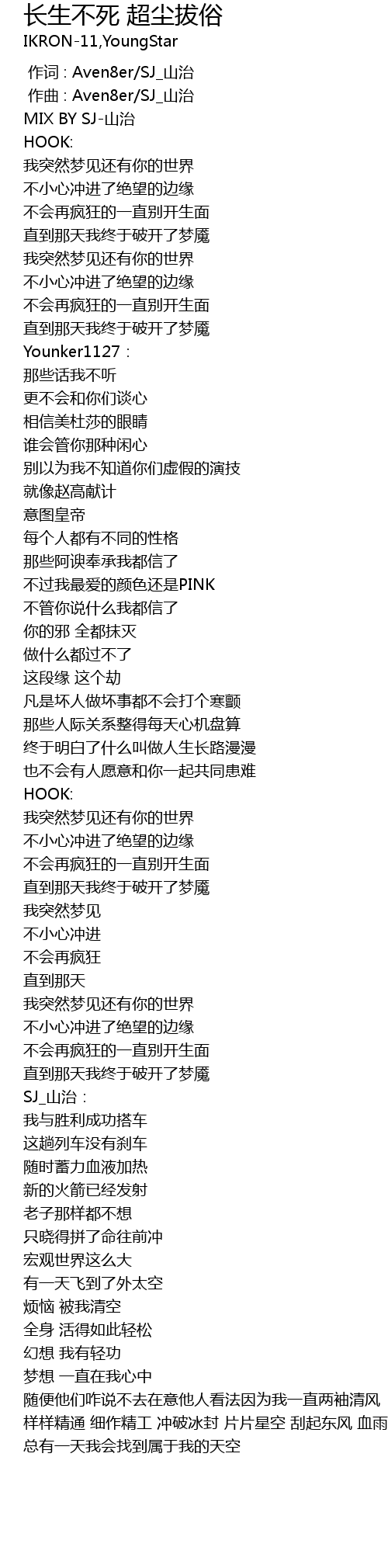 | [02:23.785] | 随便他们咋说不去在意他人看法因为我一直两袖清风 样样精通 细作精工 冲破冰封 片片星空 刮起东风 血雨腥风 |