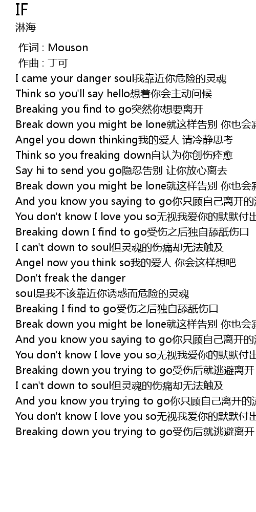 | [00:13.193] | Breaking you find to go tu ran ni xiang yao li kai |