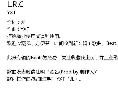 | 歌曲发表时请注明“歌名(Prod by 制作人)” 歌词栏作曲/编曲注明”YXT“即可。 |