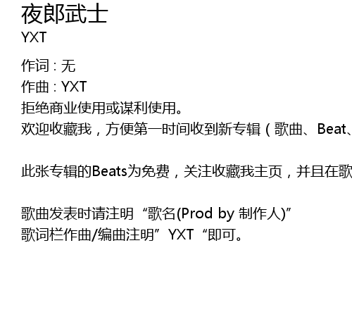| 歌曲发表时请注明“歌名(Prod by 制作人)” 歌词栏作曲/编曲注明”YXT“即可。 |