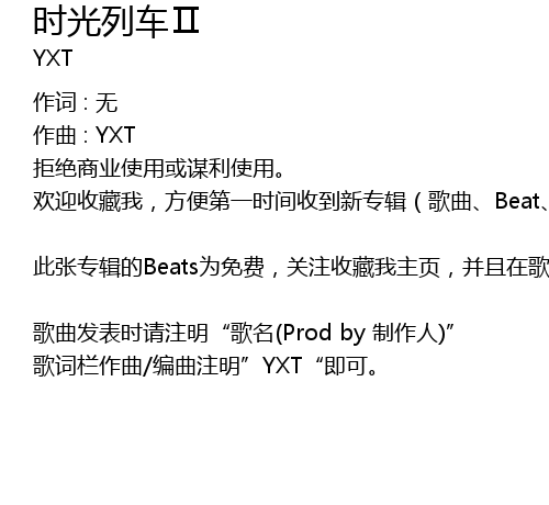 | 歌曲发表时请注明“歌名(Prod by 制作人)” 歌词栏作曲/编曲注明”YXT“即可。 |