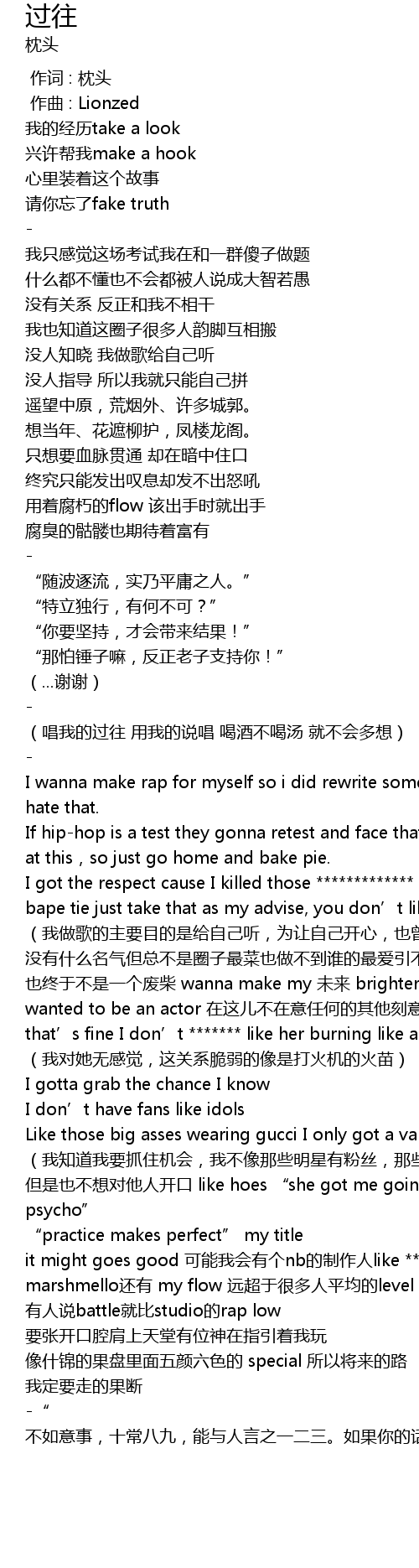 | [01:41.325] | (我做歌的主要目的是给自己听,为让自己开心,也曾改写过自认为的“假说唱”,但我不讨厌那些。如果嘻哈是一场考试,那他们都得重考。面对现实吧,你并不擅长这些,所以就你回家安心的当个家庭主妇。我赢得了尊重因为我仅用了一根领带就抹去了虚伪。这是我对你的建议,你并不喜爱这个) |