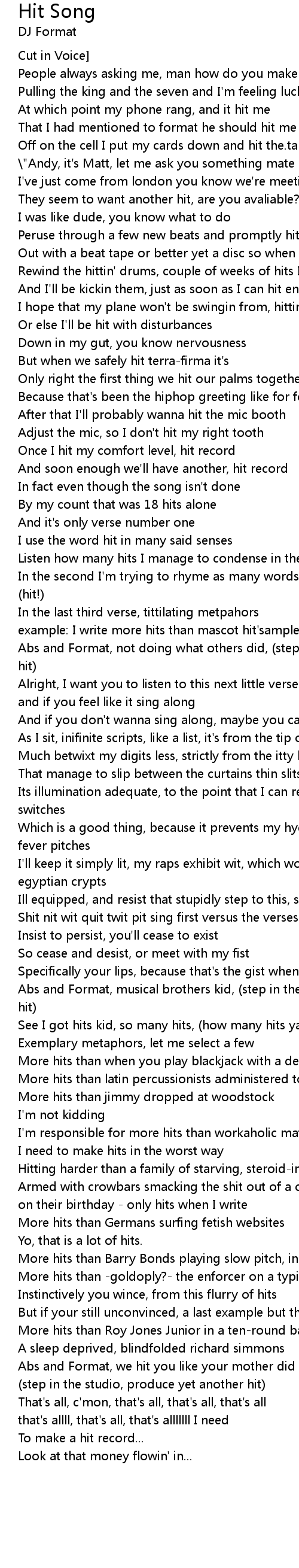 | In the second I' m trying to rhyme as many words I can find that sound like hit! | |