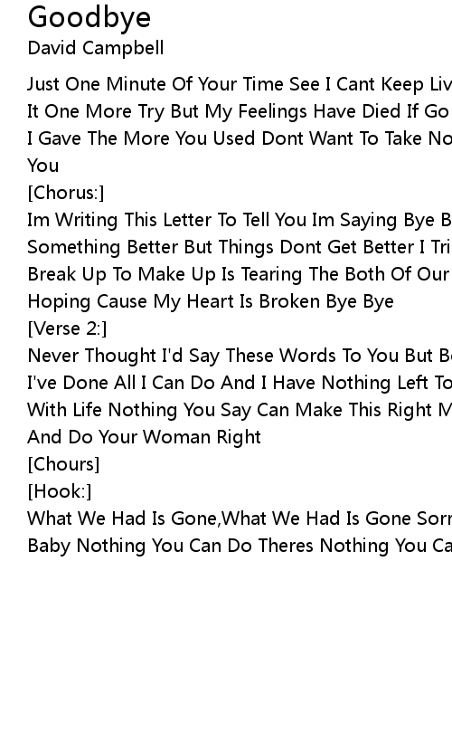 Im Writing This Letter To Tell You Im Saying Bye Bye (Bye Bye)I Hoped For Something Better But Things Dont Get Better I Tried Ooh Ooh I Tried See This Break Up To Make Up Is Tearing The Both Of Our Lives And There's No Use In Hoping Cause My Heart Is Broken Bye Bye |
