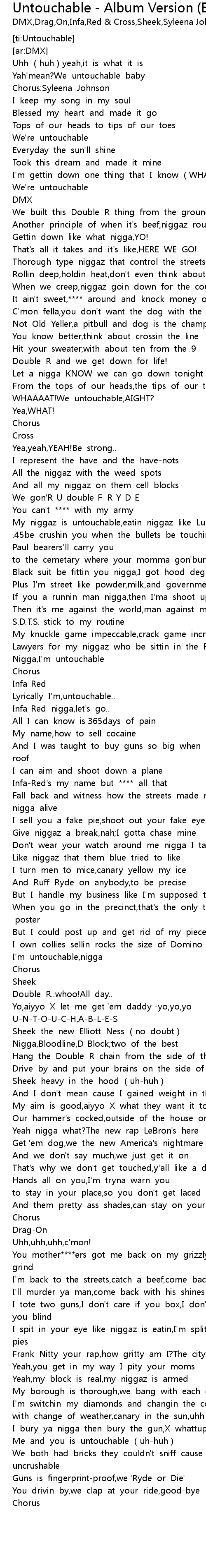 | [01:45.22] | My niggaz is untouchable, eatin niggaz like Lunchable |