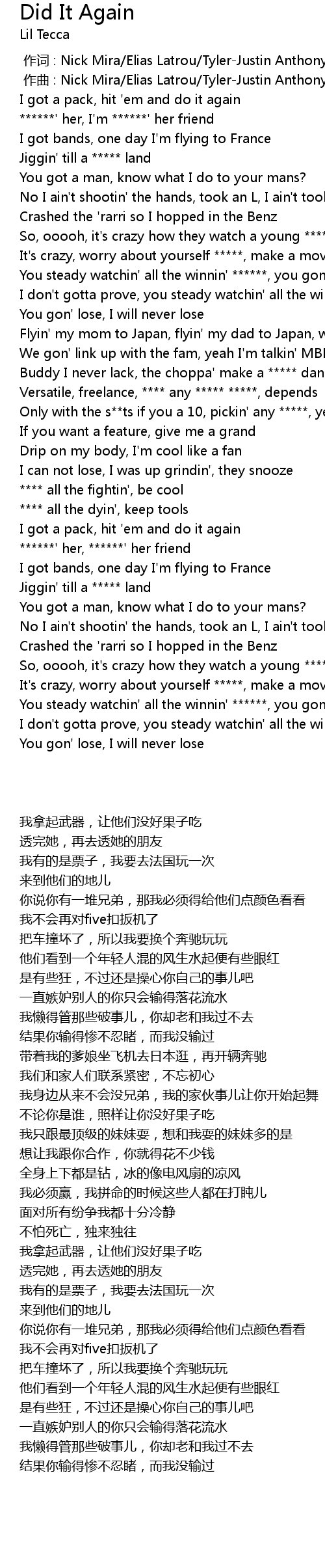 | [00:10.88] | I got a pack, hit 'em and do it again |
