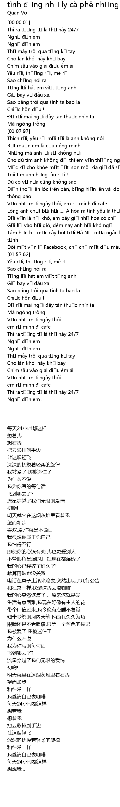 | Song | tình đắng như ly cà phê nhưng ly cà phê tui uống hơi ngọttình đắng như ly cà phê nhưng ly cà phê tui uống hơi ngọt |