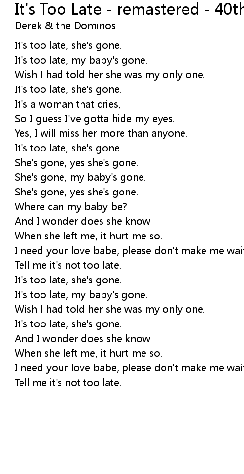 It's Too Late - remastered - 40th Anniversary version - 2010 Lyrics