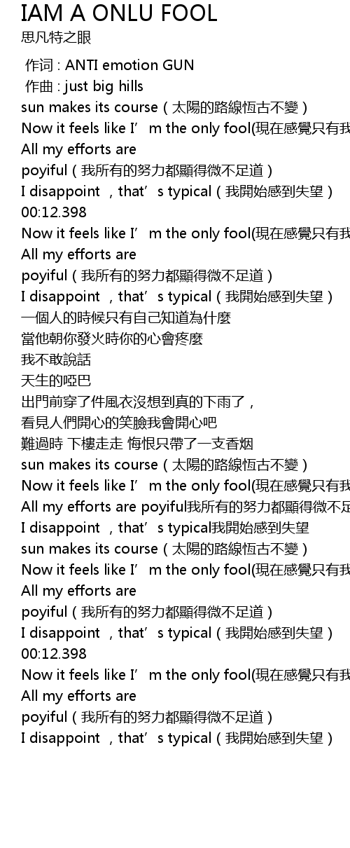 | [00:15.408] | Now it feels like I' m the only fool xiàn zài gǎn jué zhǐ yǒu wǒ hěn bèn |