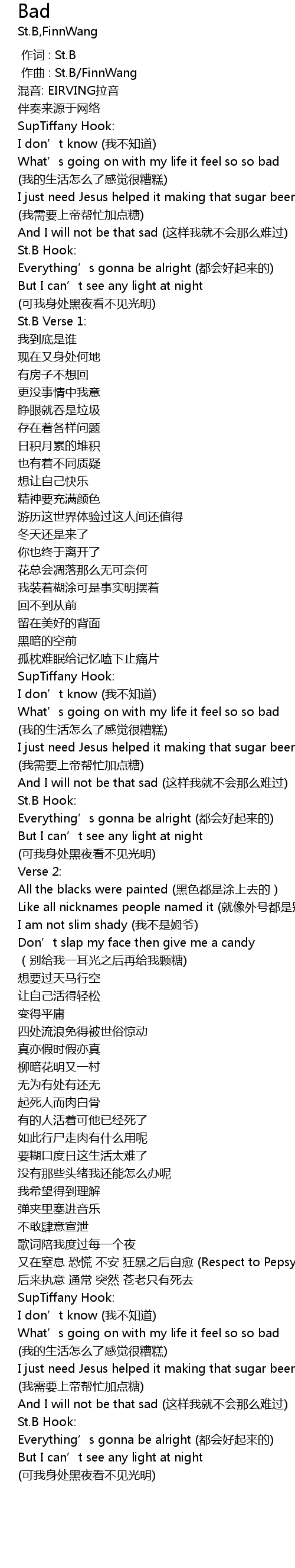| [02:34.868] | What’s going on with my life it feel so so bad (我的生活怎么了感觉很糟糕) |