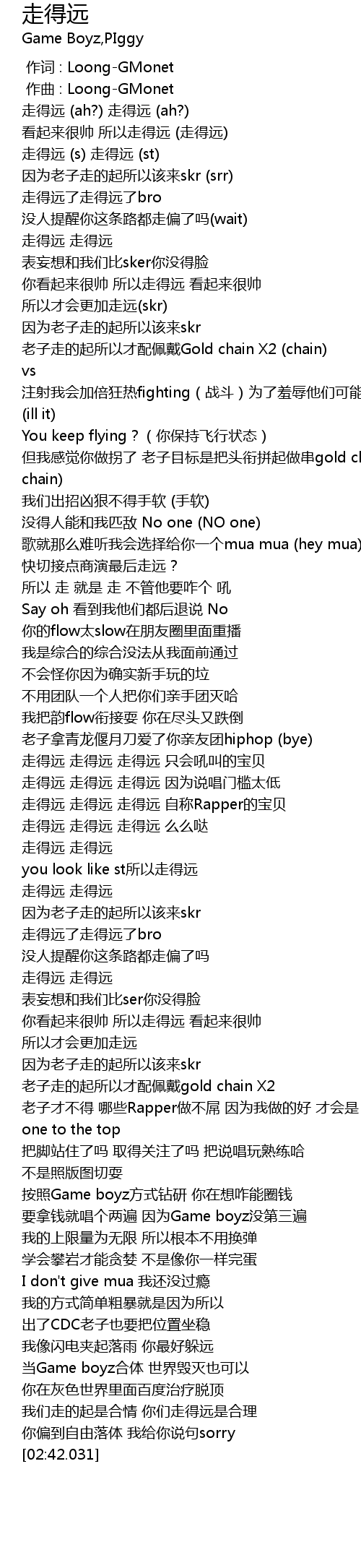 | [01:44.421] | zǒu dé yuǎn le zǒu dé yuǎn le bro |