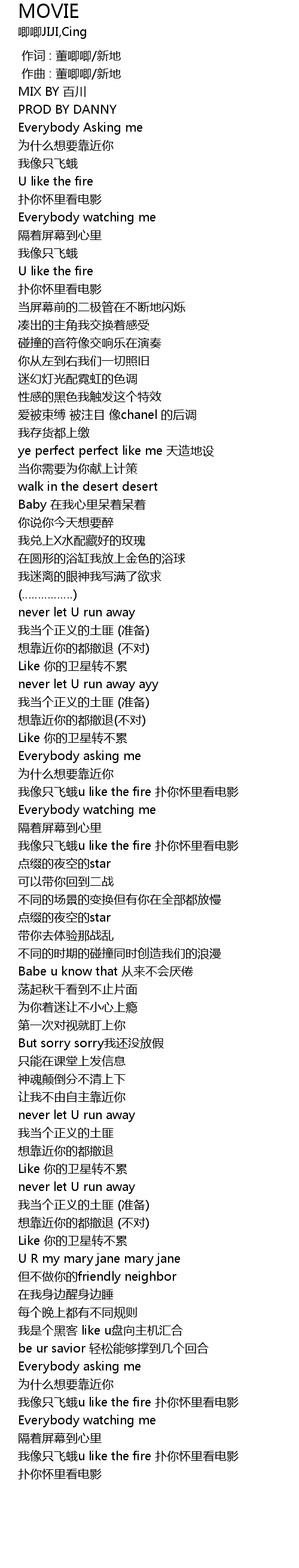 | [01:40.520] | 我像只飞蛾u like the fire 扑你怀里看电影 |