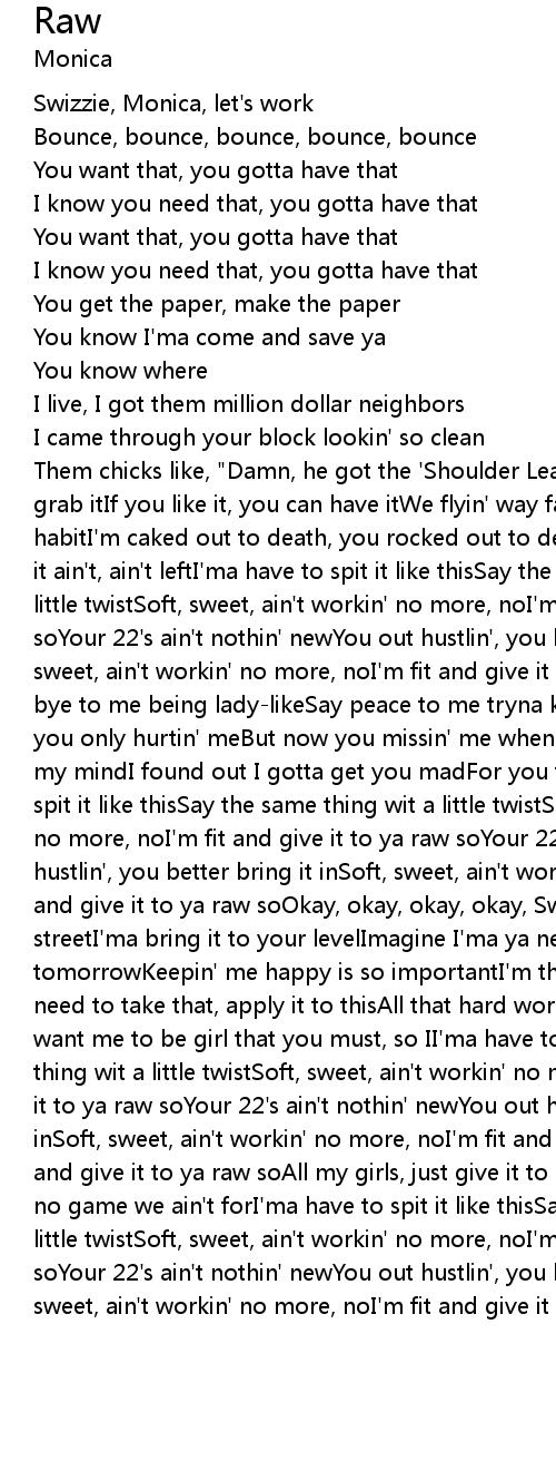 | Them chicks like, " Damn, he got the ' Shoulder Lean'" You can touch it, you can grab itIf you like it, you can have itWe flyin' way far, girl, I make that ya habitI' m caked out to death, you rocked out to deathI make ya spend it all ' til it ain' t, ain' t leftI' ma have to spit it like thisSay the same thing wit a little twistSoft, sweet, ain' t workin' no more, noI' m fit and give it to ya raw soYour 22' s ain' t nothin' newYou out hustlin', you better bring it inSoft, sweet, ain' t workin' no more, noI' m fit and give it to ya raw soNow you can say bye to me being ladylikeSay peace to me tryna keep the peaceIt ain' t work then, you only hurtin' meBut now you missin' me when I go crazyGet in line when I lose my mindI found out I gotta get you madFor you to make me glad, so II' ma have to spit it like thisSay the same thing wit a little twistSoft, sweet, ain' t workin' no more, noI' m fit and give it to ya raw soYour 22' s ain' t nothin' newYou out hustlin', you better bring it inSoft, sweet, ain' t workin' no more, noI' m fit and give it to ya raw soOkay, okay, okay, okay, SwizzieWell, since you so streetI' ma bring it to your levelImagine I' ma ya new connectYou ' bout to meet tomorrowKeepin' me happy is so importantI' m the one who can keep this callin' You need to take that, apply it to thisAll that hard work, apply it to hereIf you want me to be girl that you must, so II' ma have to spit it like thisSay the same thing wit a little twistSoft, sweet, ain' t workin' no more, noI' m fit and give it to ya raw soYour 22' s ain' t nothin' newYou out hustlin', you better bring it inSoft, sweet, ain' t workin' no more, noI' m fit and give it to ya raw soI' m fit and give it to ya raw soAll my girls, just give it to ' em raw soThem boys with no game we ain' t forI' ma have to spit it like thisSay the same thing wit a little twistSoft, sweet, ain' t workin' no more, noI' m fit and give it to ya raw soYour 22' s ain' t nothin' newYou out hustlin', you better bring it inSoft, sweet, ain' t workin' no more, noI' m fit and give it to ya raw soSo raw |