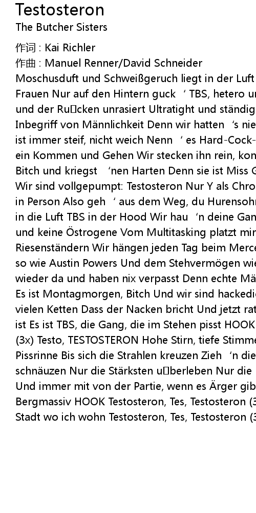 | Es ist Montagmorgen, Bitch Und wir sind hackedicht Und wir sind behangen mit so vielen Ketten Dass der Nacken bricht Und jetzt rate mal, wer hier in der Gegend ist Es ist TBS, die Gang, die im Stehen pisst HOOK Testosteron, Tes, Testosteron (3x) Testo, TESTOSTERON Hohe Stirn, tiefe Stimme Wir stehen zu sechst an der Pissrinne Bis sich die Strahlen kreuzen Zieh‘n die Nase hoch, statt zu schnäuzen Nur die Stärksten überleben Nur die härtesten Schwänze stehen Und immer mit von der Partie, wenn es Ärger gibt Bitch, diese Gang ist ein Bergmassiv HOOK Testosteron, Tes, Testosteron (3x) Mannheim am Rhein ist die Stadt wo ich wohn Testosteron, Tes, Testosteron (3x) Testo, TESTOSTERON HOOK |