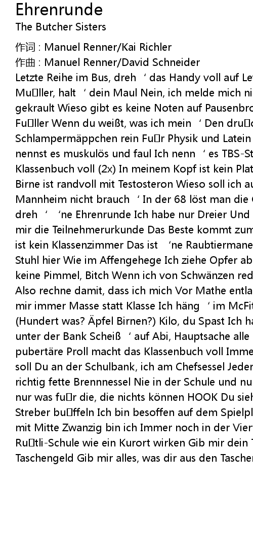 | Letzte Reihe im Bus, dreh‘ das Handy voll auf Letzte Reihe in der Klasse Frau Müller, halt‘ dein Maul Nein, ich melde mich nicht Nur die Eier werden gekrault Wieso gibt es keine Noten auf Pausenbrote klauen Immer Tinte im Füller Wenn du weißt, was ich mein‘ Den drück‘ ich auf dem Hof In jedes Schlampermäppchen rein Für Physik und Latein ist mein Gehirn zu klein Du nennst es muskulös und faul Ich nenn‘ es TBS-Style, Junge Mach das Klassenbuch voll (2x) In meinem Kopf ist kein Platz Für Polynomdivision Diese Birne ist randvoll mit Testosteron Wieso soll ich auch lernen Was ich in Mannheim nicht brauch‘ In der 68 löst man die Gleichung mit der Faust Ich dreh‘ ‘ne Ehrenrunde Ich habe nur Dreier Und krieg‘ mündlichen Sex Reich mir die Teilnehmerurkunde Das Beste kommt zum Schluss Wir sind T zum B zum S Das ist kein Klassenzimmer Das ist ‘ne Raubtiermanege Kommt der Lehrer, fliegt der Stuhl hier Wie im Affengehege Ich ziehe Opfer ab und addiere Schläge Ich meine keine Pimmel, Bitch Wenn ich von Schwänzen rede | |