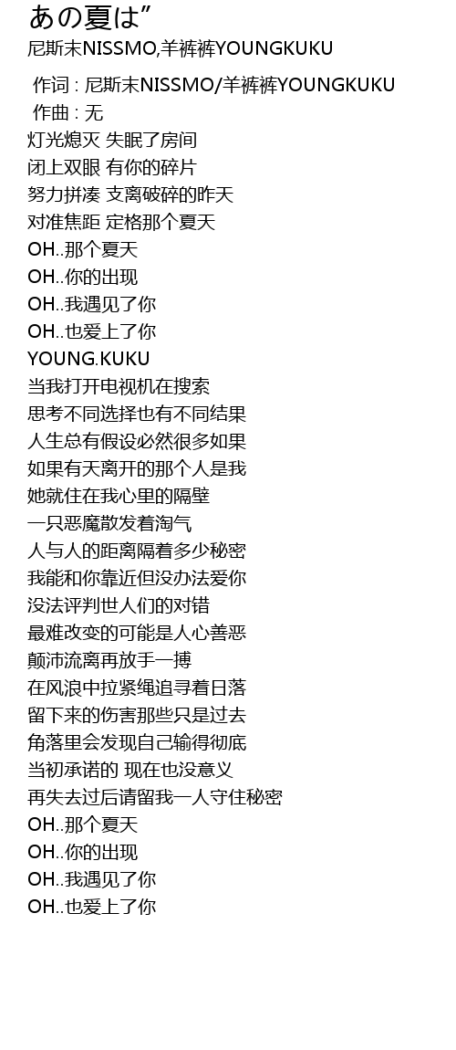 | [00:00.000] | 作词 : 尼斯末NISSMO/羊裤裤YOUNGKUKU |