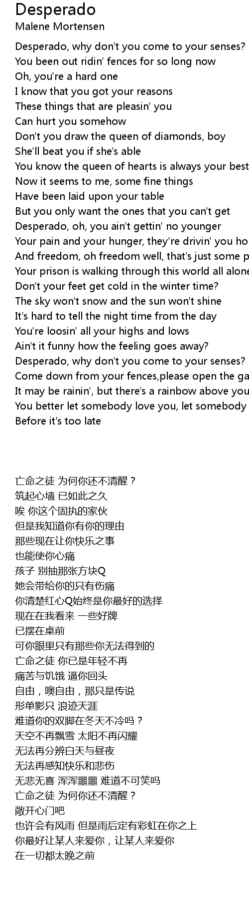 [01:27.49] Desperado, oh, you ain't gettin' no younger