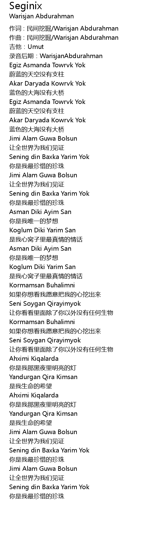 | 作词 : 民间挖掘/Warisjan Abdurahman | |