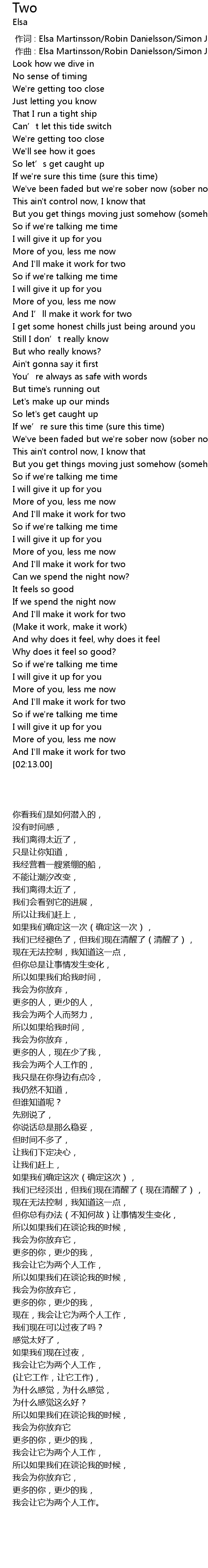 | [00:00.000] | 作词 : Elsa Martinsson/Robin Danielsson/Simon Jonasson |