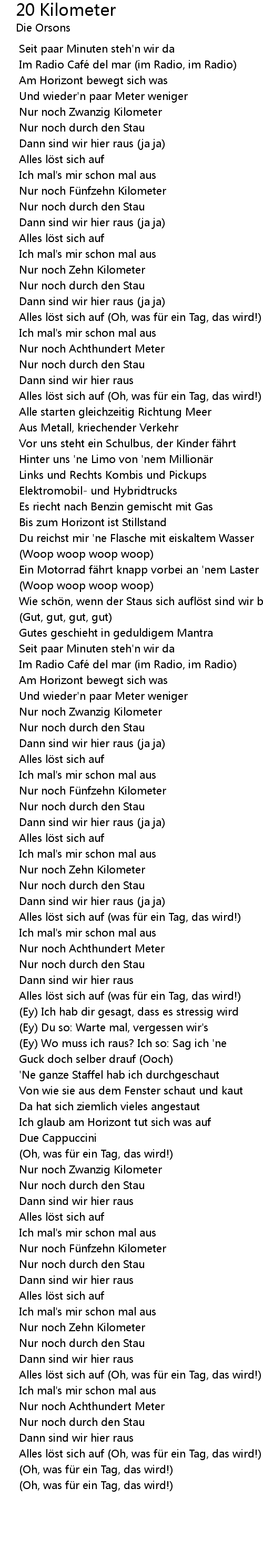 | [00:17.002] | Nur noch Zwanzig Kilometer |