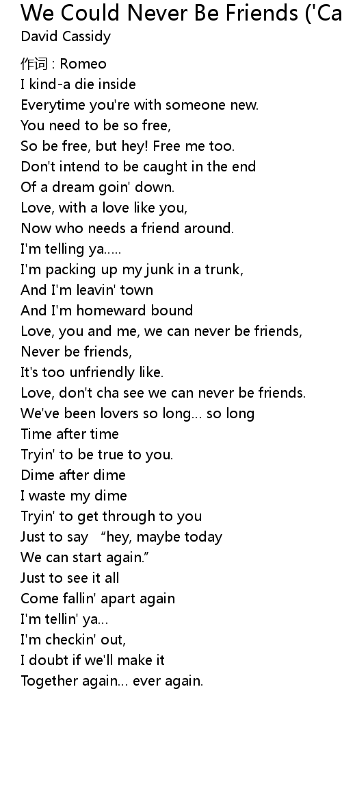 | Song | We Could Never Be Friends ('Cause We've Been Lovers Too Long) |