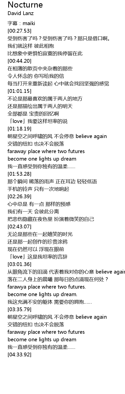 | [03:10.33] | 落在二人身上的晨曦 那每日的点滴现在何处? |