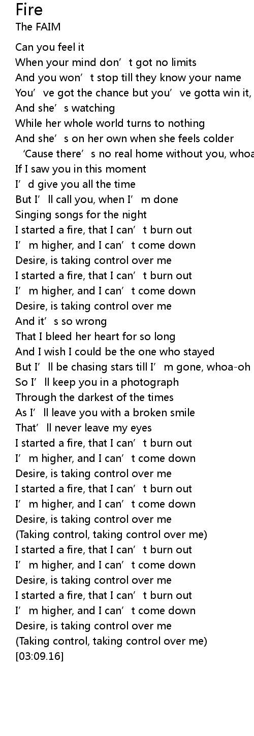 | [02:32.53] | I started a fire, that I can' t burn out |