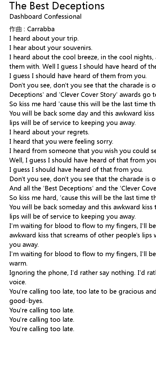| Don' t you see, don' t you see that the charade is over? and all the ' Best Deceptions' and ' Clever Cover Story' awards go to you. | |