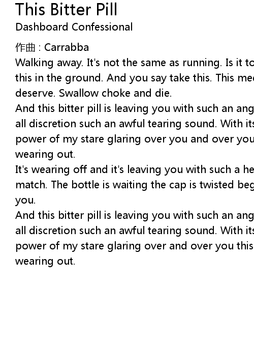 | And this bitter pill is leaving you with such an angry mouth. One that' s void of all discretion such an awful tearing sound. With its measure only equaled by the power of my stare glaring over and over you this feeling of despair is never wearing out. |
