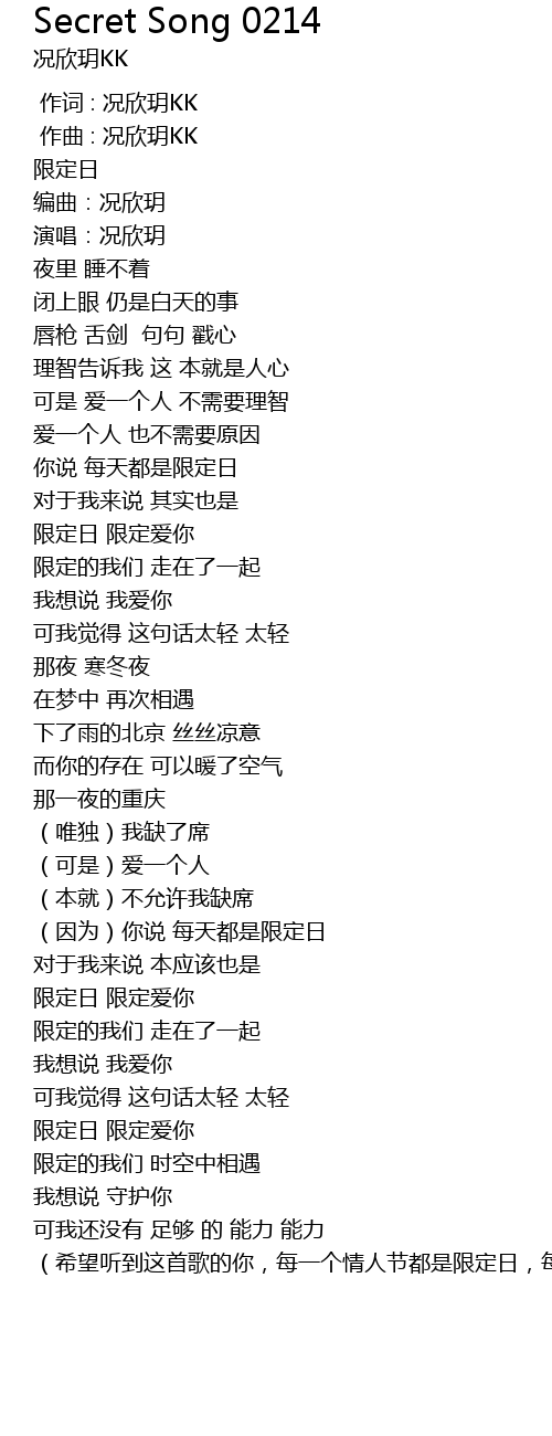| [03:36.078] | (希望听到这首歌的你,每一个情人节都是限定日,每一个限定日都有你心中限定的人。) |