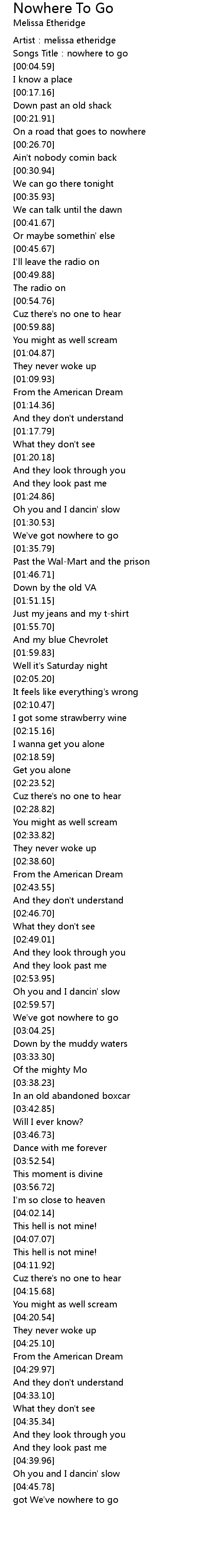 | [00:01.52] | Artist: melissa etheridge |