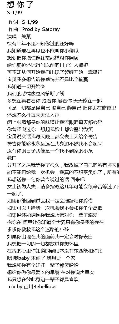 | [01:12.870] | 独白 分开了之后我等你了很久,我改掉了自己的所有坏习惯,我真的后悔了,没有你的日子我真的好难受,你曾说过吧灵魂都交给我了可是我没有珍惜,对不起宝贝是我让你心碎一次又一次 |