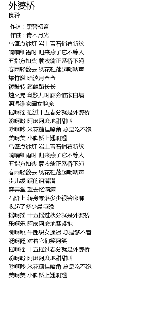 | [01:15.695] | yáo a yáo yáo guò shí wǔ chūn fēn jiù shì wài pó qiáo |
