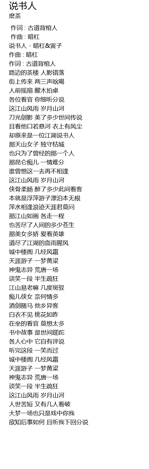 | [00:14.431] | 说书人 - 暗杠&寅子 |
