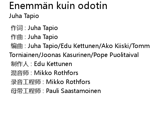 | [00:00.000] | bian qu : Juha Tapio Edu Kettunen Ako Kiiski Tommi Viksten Kalle Torniainen Joonas Kasurinen Pope Puolitaival |