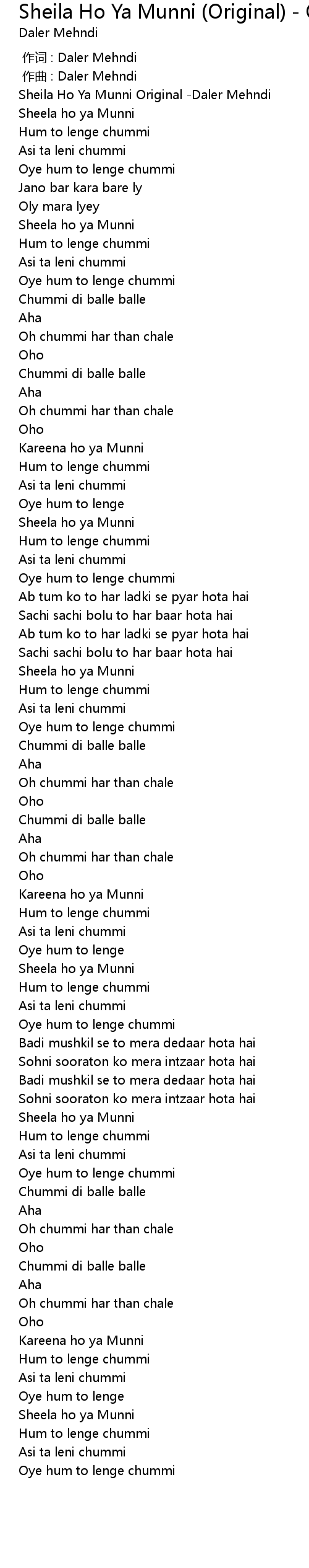 | [00:00.413] | Sheila Ho Ya Munni Original Daler Mehndi |