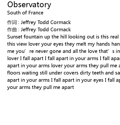 | Sunset fountain up the hill looking out is this real all the life that' s in this view lover your eyes they melt my hands hand in hand on fountain close to me you' re never gone and all the love that' s in my heart it melts with you lover I fall apart I fall apart in your arms I fall apart in your eyes I fall apart in your arms lover your arms they pull me apart faded signs and wooden floors waiting still under covers dirty teeth and sand under the sheets I fall apart in your arms I fall apart in your eyes I fall apart in your arms lover your arms they pull me apart |