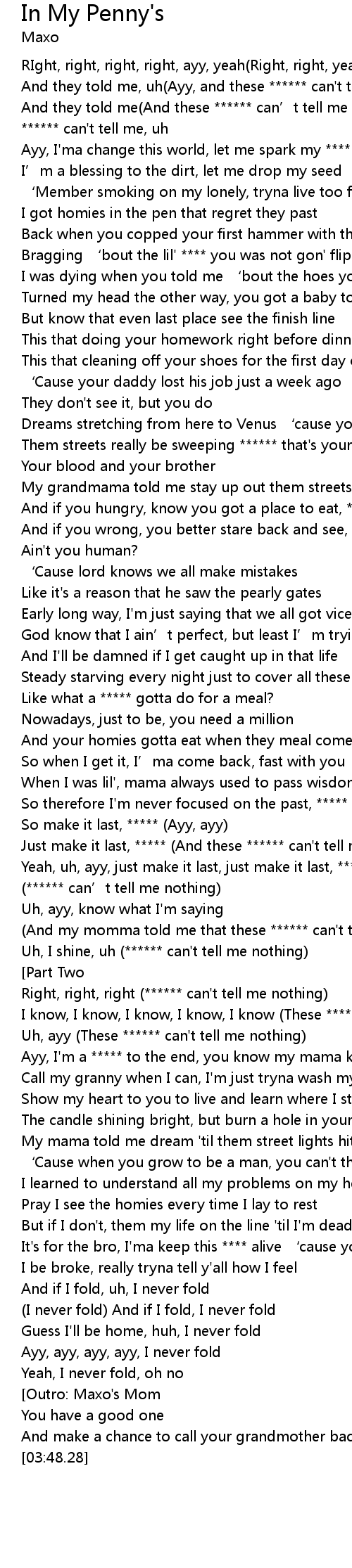 | [02:24.47] | Ayy, I'm a ***** to the end, you know my mama know that |