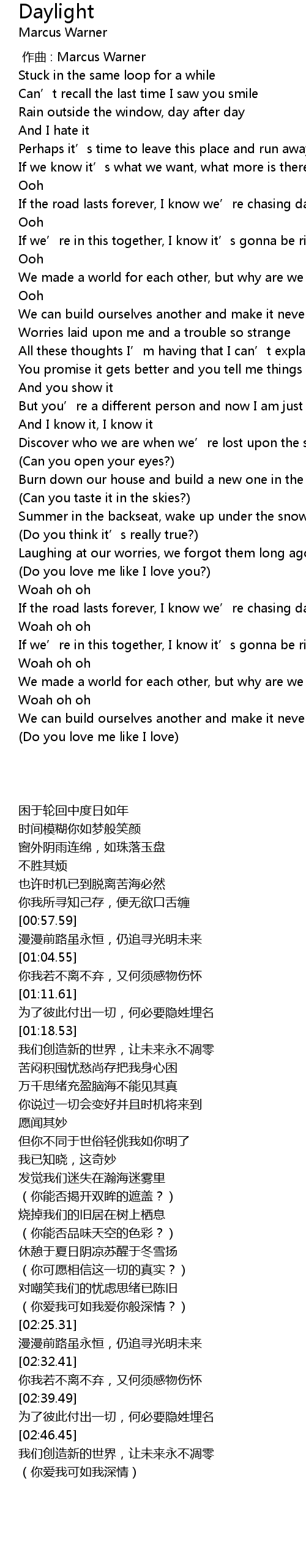 | [02:28.39] | If the road lasts forever, I know we’re chasing daylight |